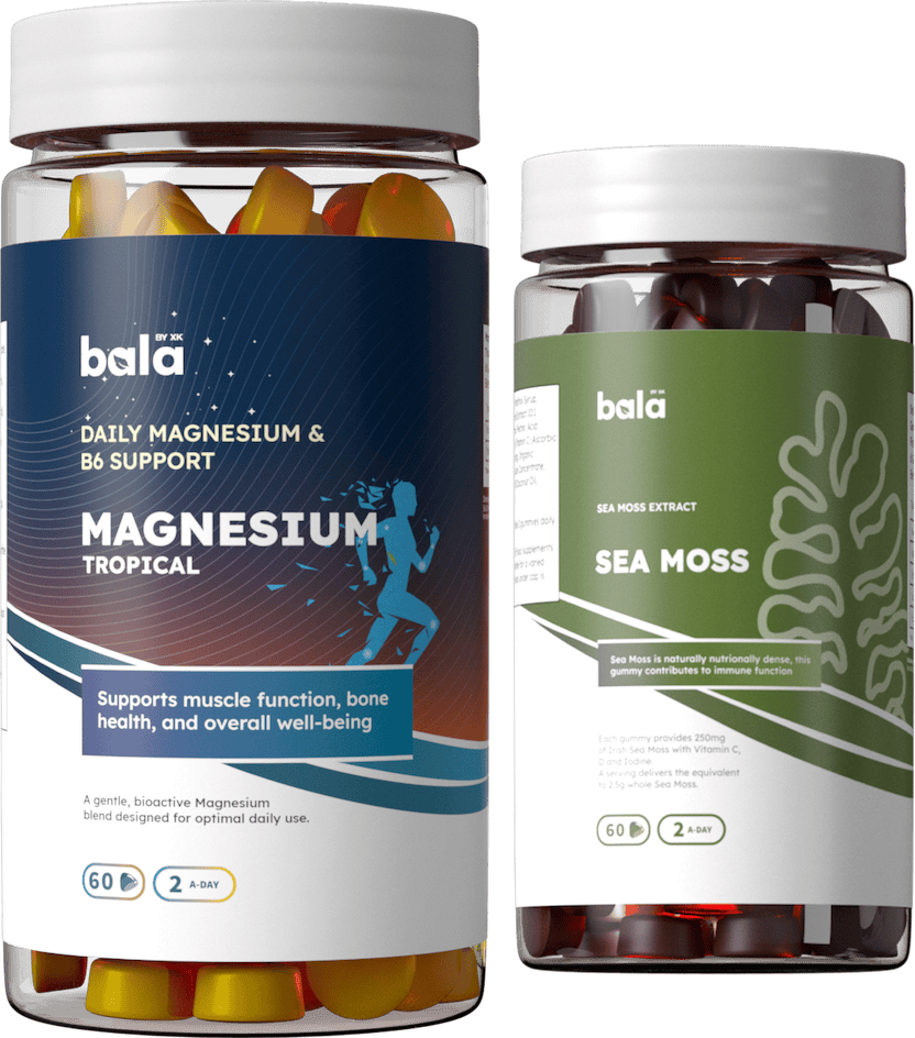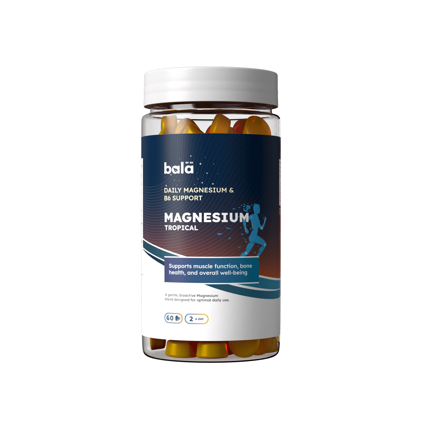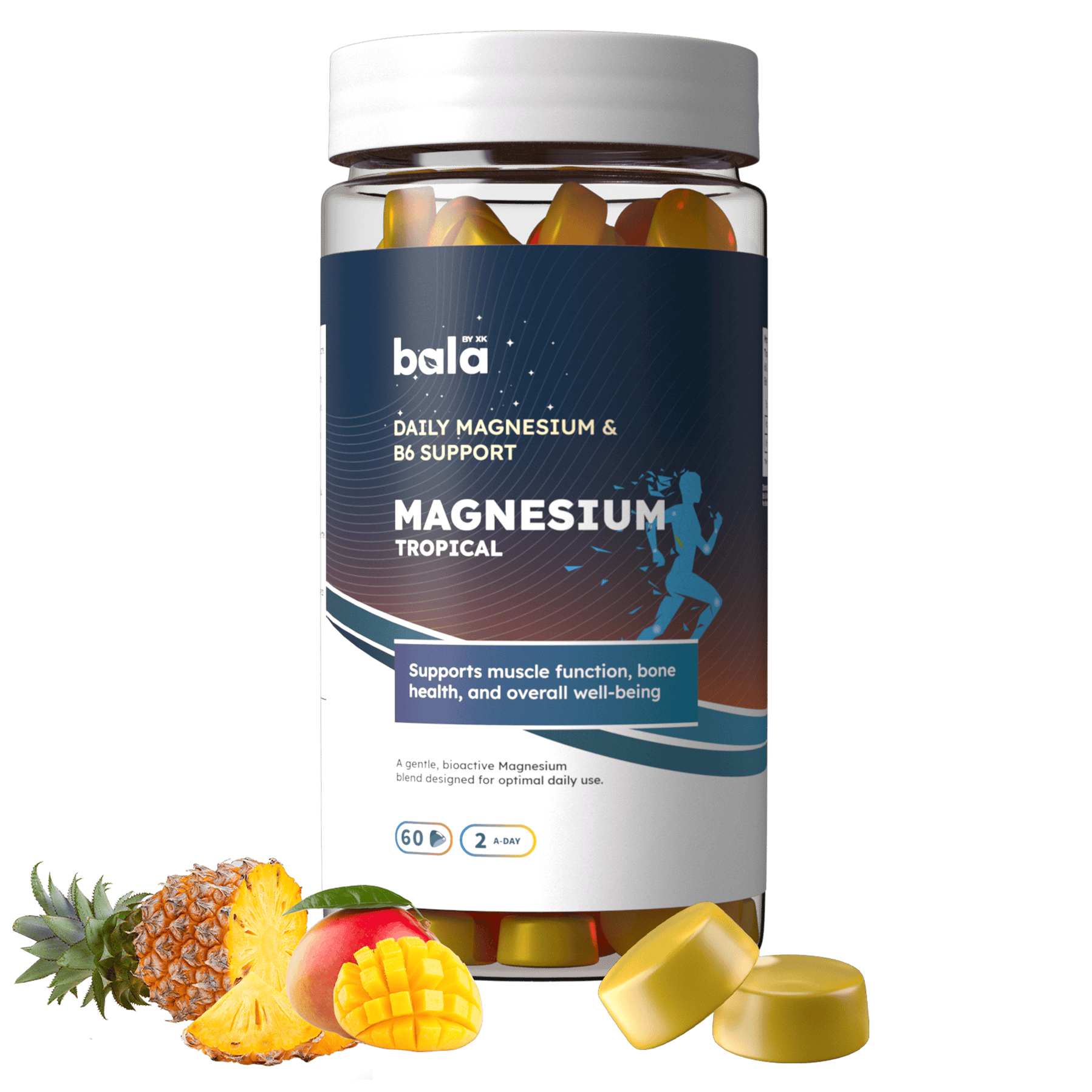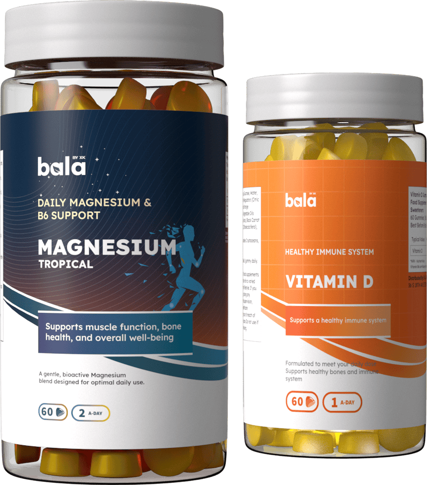 Experience daily calm and physical support for your muscles with Bala Nutritions Magnesium Tropical Gummies. Carefully formulated to support normal muscle function, bone health, and overall well-being, these gummies combine a bioactive form of magnesium with Vitamin B6 — an essential duo for energy, relaxation, and nervous system balance. With a refreshing mango–pineapple tropical flavor, each gummy becomes a simple and enjoyable way to get your daily magnesium intake.