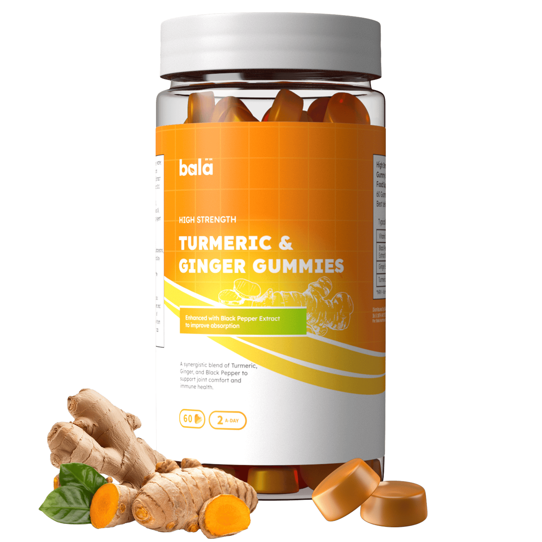 Experience powerful natural support for joint comfort and immune health with Bala Nutritions Turmeric & Ginger Gummies. Formulated with high-strength extracts of turmeric and ginger, these gummies offer an easy and delicious way to support your daily well-being. With a refreshing orange flavour, each gummy delivers potent botanical benefits in a simple daily routine.